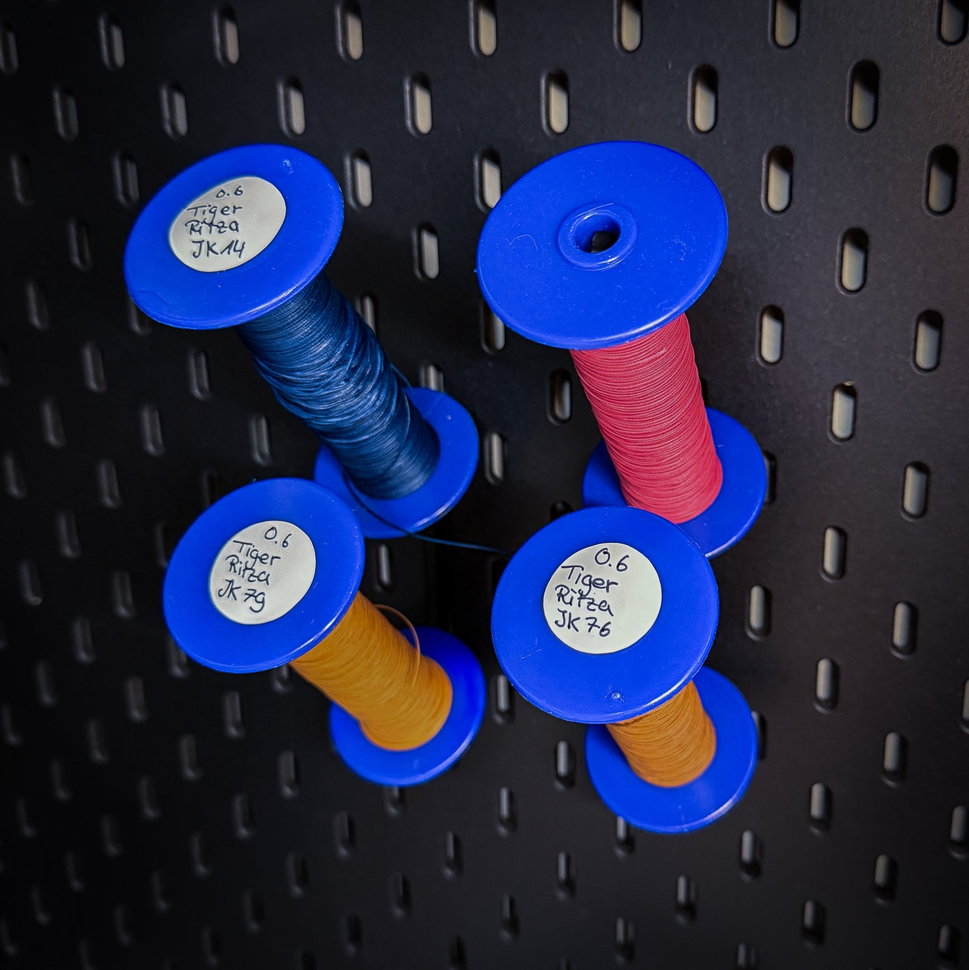 Mit diesem Halter hast du deine Garnrollen jederzeit griffbereit – sortiert nach Farben – und kannst direkt loslegen, ohne Rollen abzunehmen.