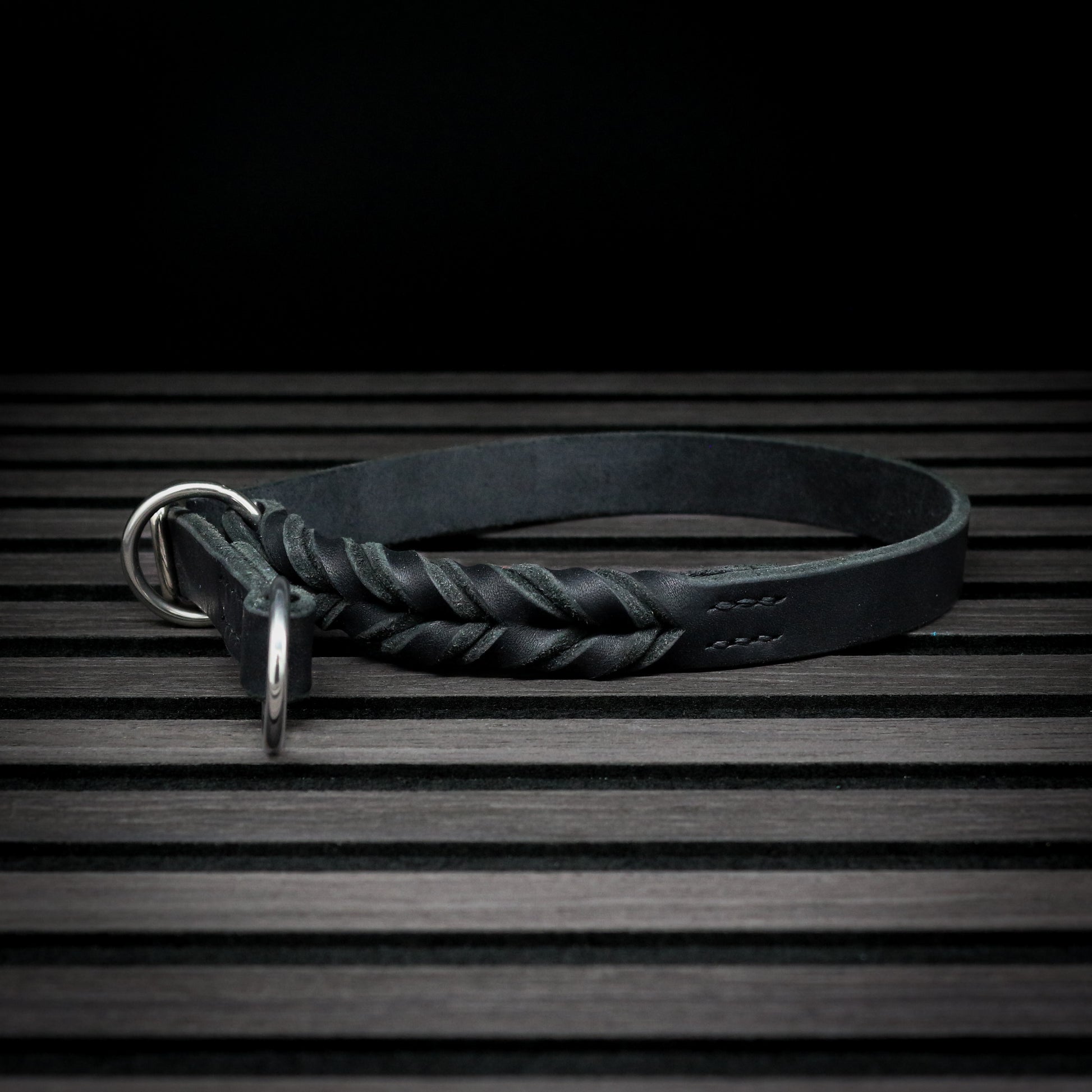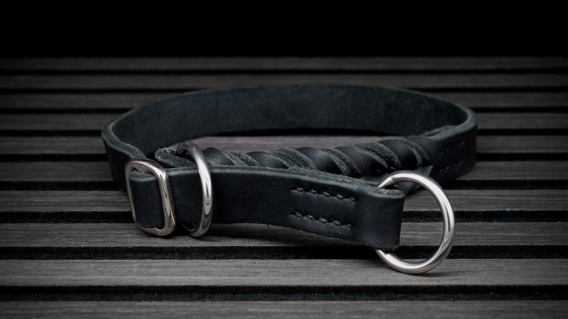 Zugstopp Halsband mit Beschlägen aus Edelstahl oder Messing.
